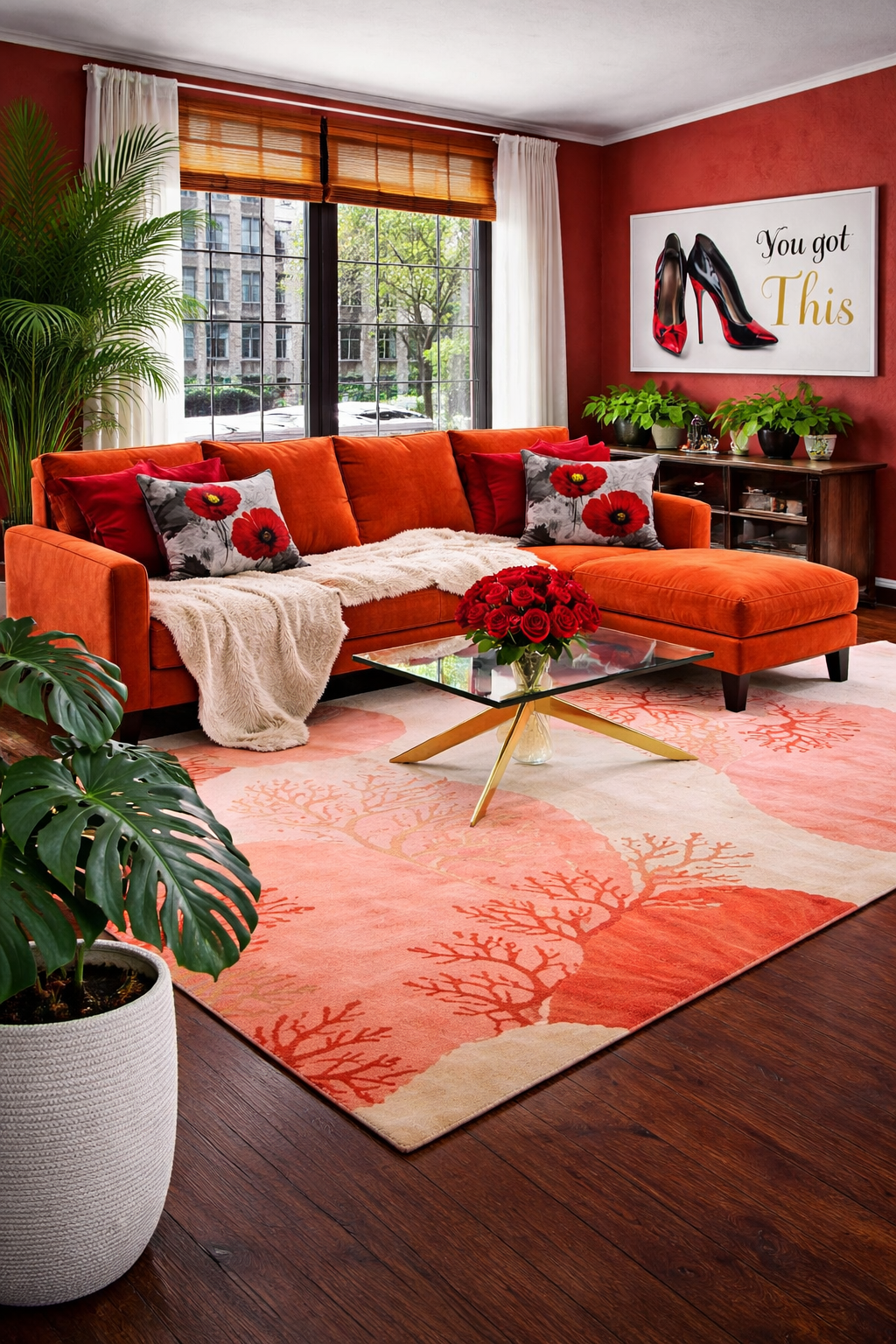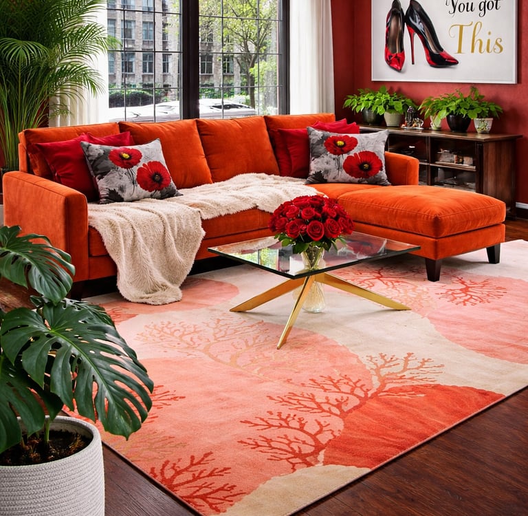 This living room is a bold, high-glam moment wrapped in burnt orange, deep coral, and rich crimson tones. The oversized sectional anchors the space with plush comfort, while dramatic floral accents, layered throw pillows, and a sculptural glass-and-gold coffee table bring in that curated, designer feel. Every detail—from the statement wall art to the lush greenery—adds warmth, depth, and unapologetic personality.